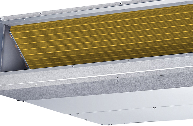 Īpašs zelta pārklājums uz siltummaiņa ribām nodrošina ilgstošu aizsardzību pret koroziju, ko izraisa mitrums, putekļi un sāļš gaiss. Tas ne tikai pagarina iekārtas kalpošanas laiku, bet arī palīdz uzturēt tīru gaisa plūsmu, novēršot baktēriju un pelējuma veidošanos siltummaiņa iekšpusē. Pateicoties šai tehnoloģijai, iekārta saglabā augstu efektivitāti un higiēnisku darbību pat intensīvas ekspluatācijas apstākļos.
