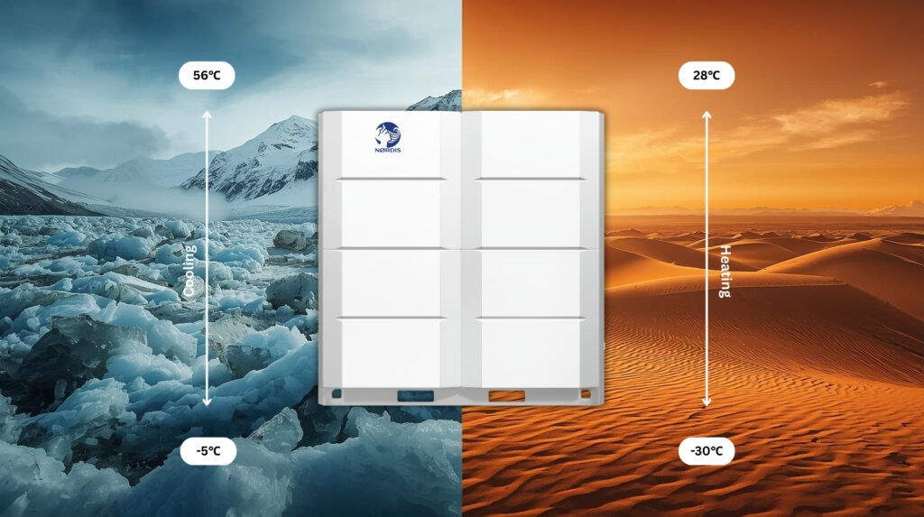 NØRDIS VRF sistēmas ir izstrādātas efektīvai darbībai ekstremālos klimatiskajos apstākļos — no –30 °C līdz +56 °C, nodrošinot uzticamu dzesēšanu un apkuri visa gada garumā neatkarīgi no sezonas vai apkārtējās vides apstākļiem.